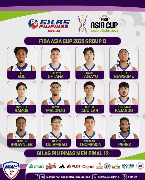 필리핀 농구연맹 SBP는 31일(이하 한국시간) 오는 8월 사우디아라비아 제다에서 열리는 2025 FIBA 남자농구 월드컵에 출전할 최종 엔트리 12인을 발표했다.