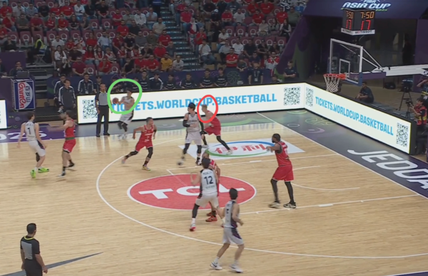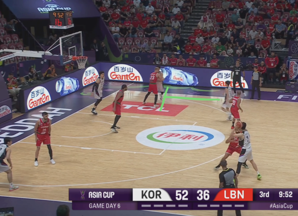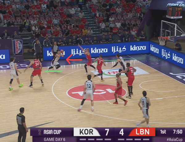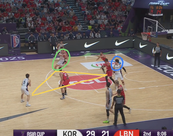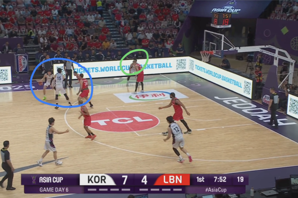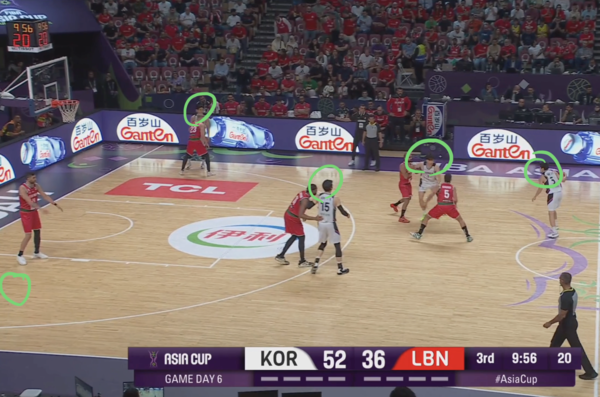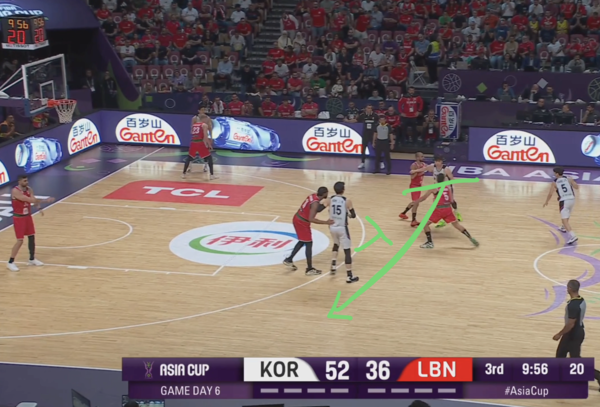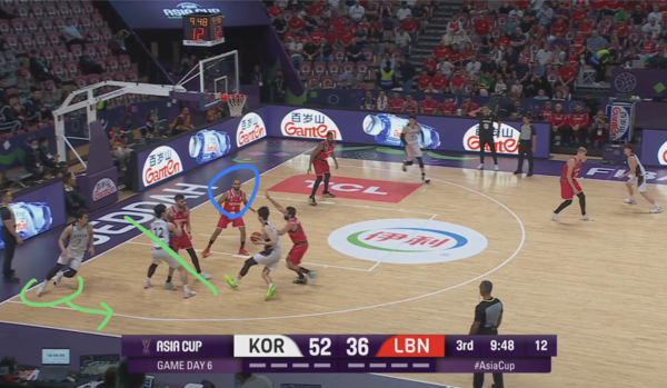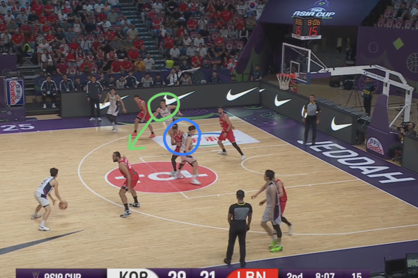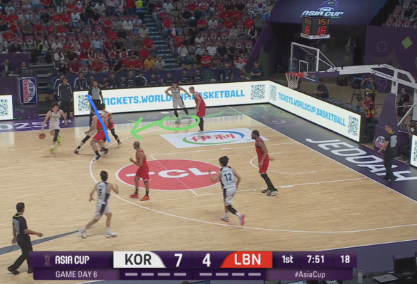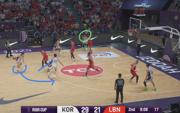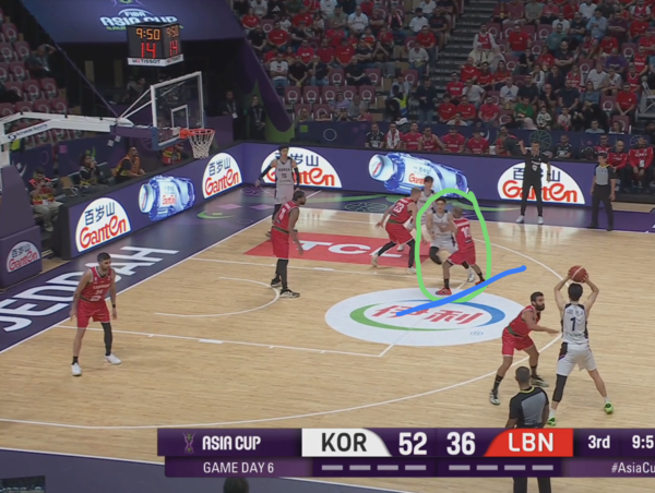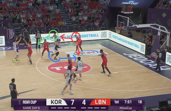 때문에 코너의 유기상을 막던 레바논의 코너 수비수(빨간색 원)은 림으로 대쉬하는 김종규에 대한 태깅 혹은 스크램 스위치(두 번째 스위치로 마크맨을 바꾸는 미스매치 보완 수비법)에 대한 책임이 생긴다.