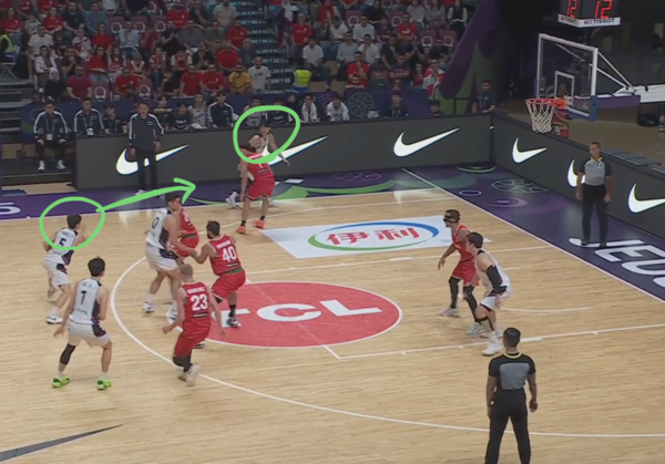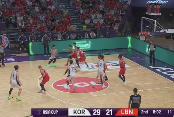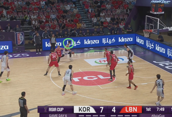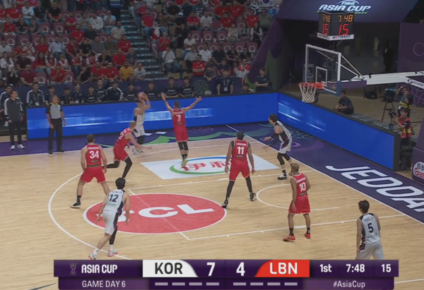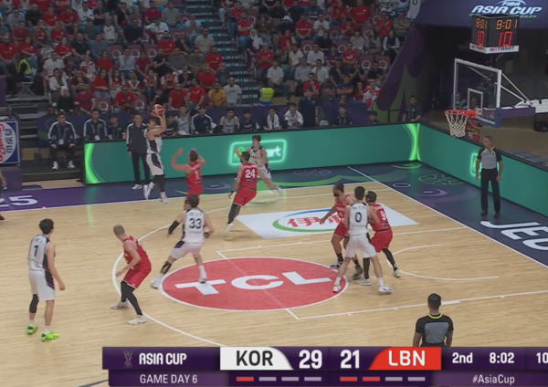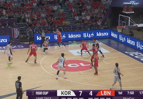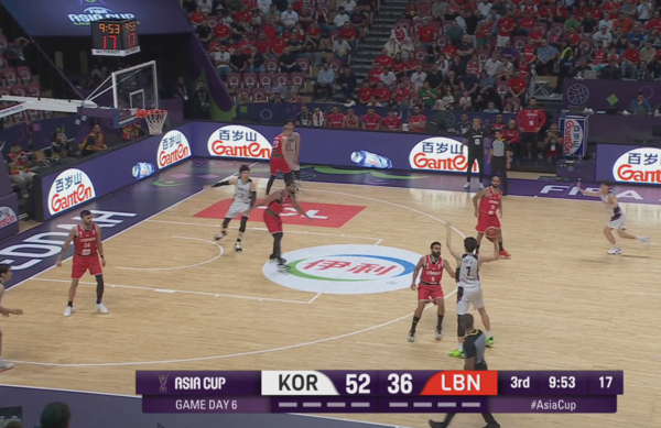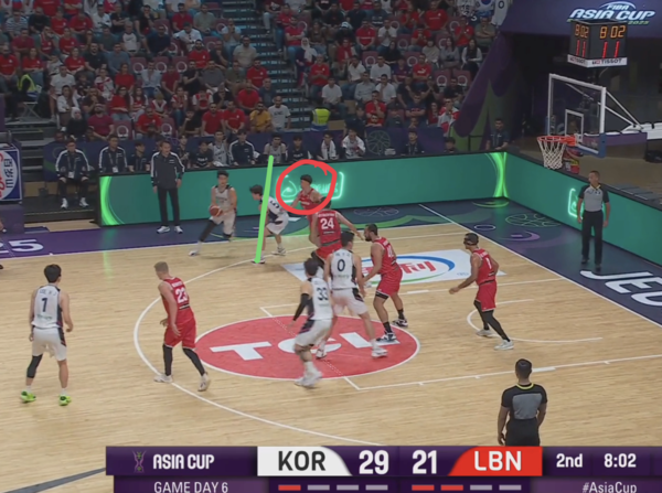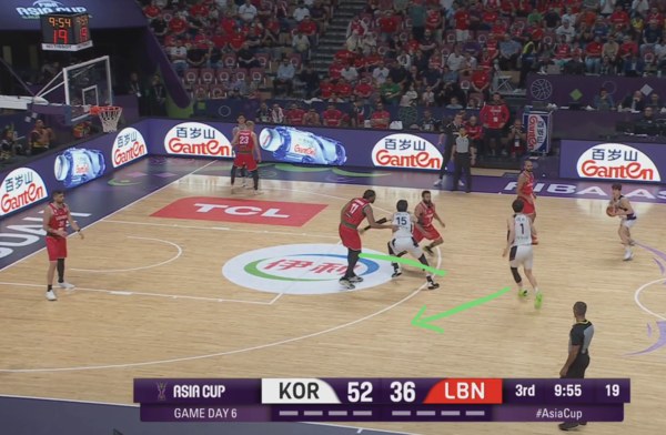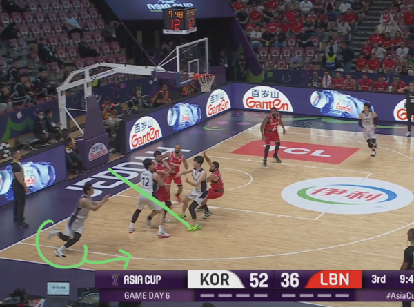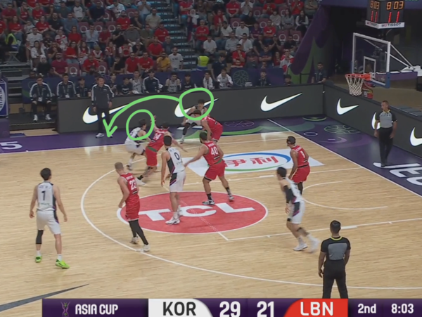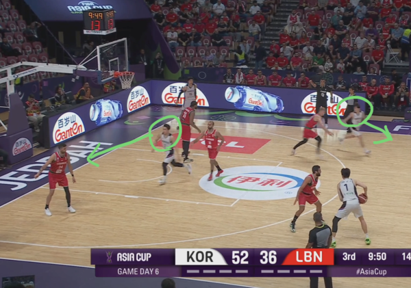 전반 내내 한국의 오프 볼 무브 패턴에 당했던 레바논이 발빠르게 대응, 정상적으로 마크맨들을 따라간다. 이현중이 곧바로 손짓하며 다음 액션이 시작된다.