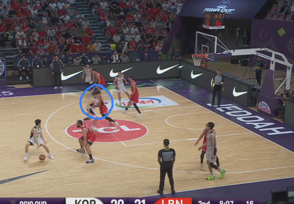레바논은 양준석과 하윤기의 2대2에 대해서도 곧바로 스위치로 대응한다. 이때 양준석은 왼쪽으로 드리블을 이어가며 왼쪽 코너의 유기상을 바라보며 다음 액션을 준비한다.