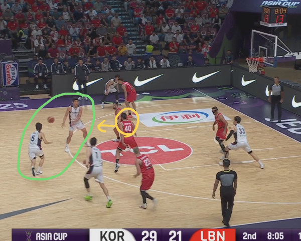 이때 레바논의 40번은 첫 스위치 수비로 양준석을 마크하게 된 상황에서, 핸드오프 2대2 게임까지 따라가야 하는 부담이 순간적으로 생긴다.
