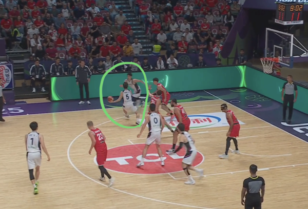 이현중과 가장 가까운 헬프 수비수들의 위치와 코너와 반대 윙이다. 이현중이 아이솔레이션 상태를 놓치지 않고 특유의 왼쪽 돌파를 시작한다.(위와 같은 이현중 주변의 스페이싱 상태를 전술적으로는 더블 갭(double gap) 상태라고 부르기도 한다.)