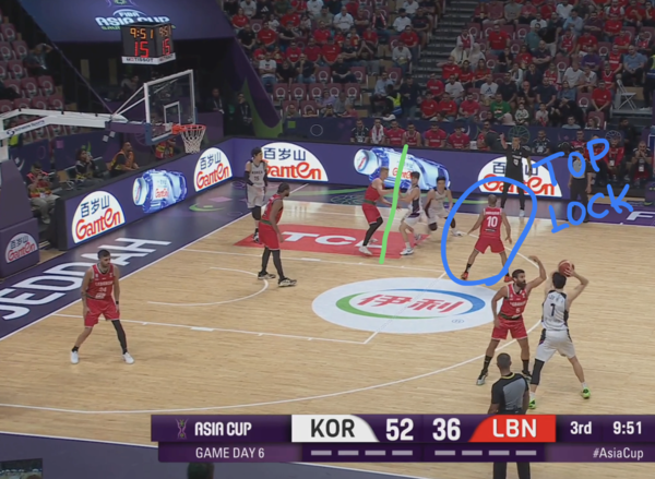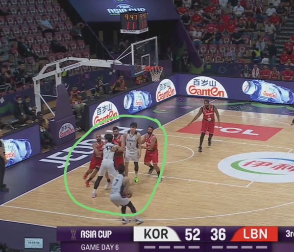 이날 레바논은 한국의 2대2에 대해 자동 스위치에 가까운 노골적인 스위치 수비를 사용했고, 위 장면에서도 마찬가지였다.