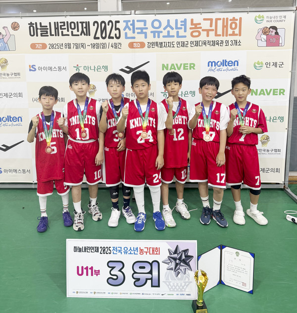 강남 SK(SK주니어나이츠 강남1지점&서초점)는 지난 7일부터 10일까지 강원도 인제군에서 개최된 2025 하늘내린인제 전국 유소년 농구대회 U11부에 출전해 강팀들과의 경쟁에서 우위를 점하며 전국구 강팀으로서의 입지를 공고히 했다.