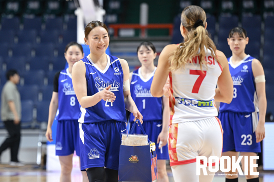 1일 부산 사직실내체육관에서 ‘2025 BNK금융 박신자컵’이 열렸다. 헝가리의 DVTK와 인천 신한은행의 경기가 열렸다. 신한 김진영이 상대 선수와 선물을 교환하고 있다.