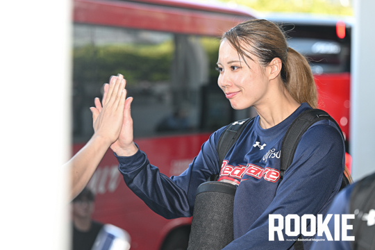 3일 부산 사직실내체육관에서 ‘2025 BNK금융 박신자컵’이 열렸다. 후지쯔와 사라고사의 경기가 열렸다. 후지쯔 후지모토 아키가 팬과 손을 마주치고 있다.