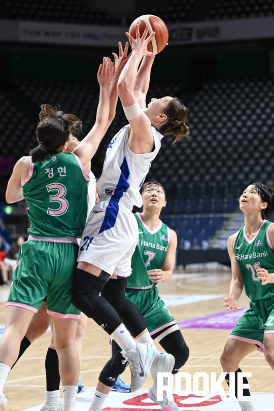 4일 부산 사직실내체육관에서 ‘2025 BNK금융 박신자컵’이 열렸다. 인천 신한은행과 부천 하나은행의 경기가 열렸다. 신한 김진영이 리바운드를 잡고 있다.
