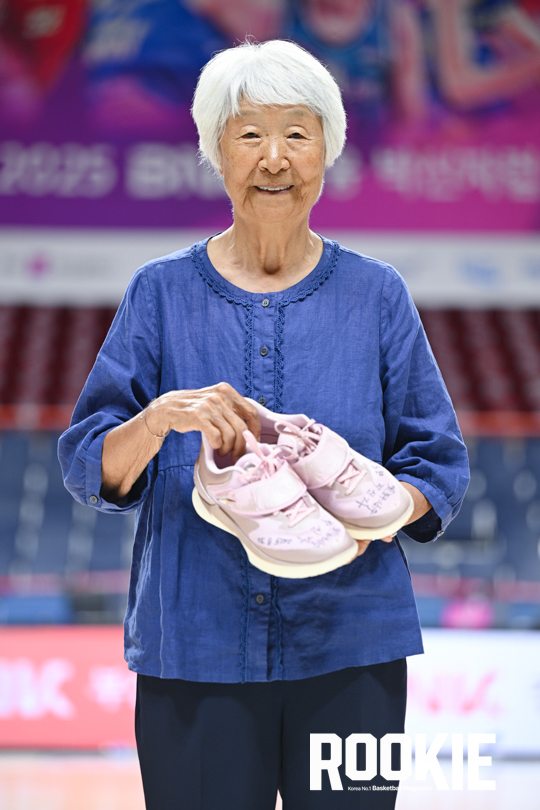 7일 부산 사직실내체육관에서 ‘2025 BNK금융 박신자컵'은 일본 후지쯔 레드웨이브의 우승으로 대회를 마무리하였다. 대회를 마치고 박신자 여사가 농구화를 기증하며 기념사진 촬영을 하고 있다.