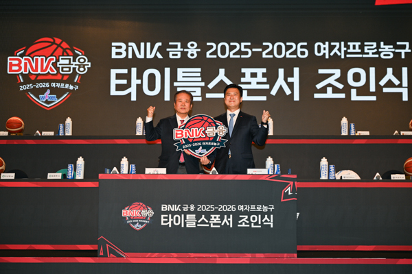 10일 강서구에 위치한 메이필드 호텔에서 ‘BNK 금융 2025~2026 여자프로농구’ 타이틀스폰서 조인식이 열렸다. 신상훈 WKBL 총재와 김용규 경영전략그룹장이 기념사진 촬영을 하고 있다.