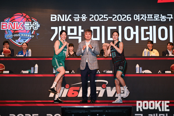 10일 강서구에 위치한 메이필드 호텔에서 ‘BNK 금융 2025~2026 여자프로농구’ 미디어데이가 열렸다. 하나은행 양인영, 이상범 감독, 김정은(왼쪽부터)이 포즈를 취하고 있다.