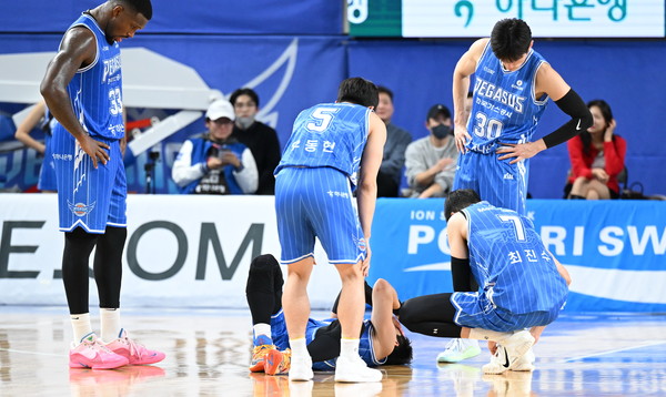 안면을 가격당한 정성우는 충돌 후 곧바로 코트에 쓰러졌고 허훈은 3점슛 성공을 기록했다.