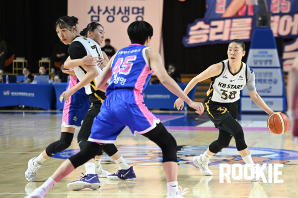 19일 용인 실내체육관에서 ‘BNK 금융 2025~2026 여자프로농구’ 용인 삼성생명과 청주 KB스타즈의 경기가 열렸다. KB스타즈 박지수와 나윤정이 2:2플레이를 하고 있다.