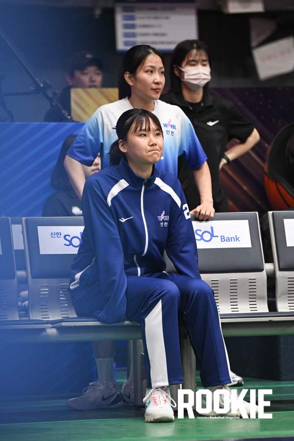 21일 인천에 위치한 도원체육관에서 ‘BNK 금융 2025~2026 여자프로농구’ 인천 신한은행과 부천 하나은행의 경기가 열렸다. 신한은행 미마 루이가 부상으로 결장하여 경기를 보고 있다.