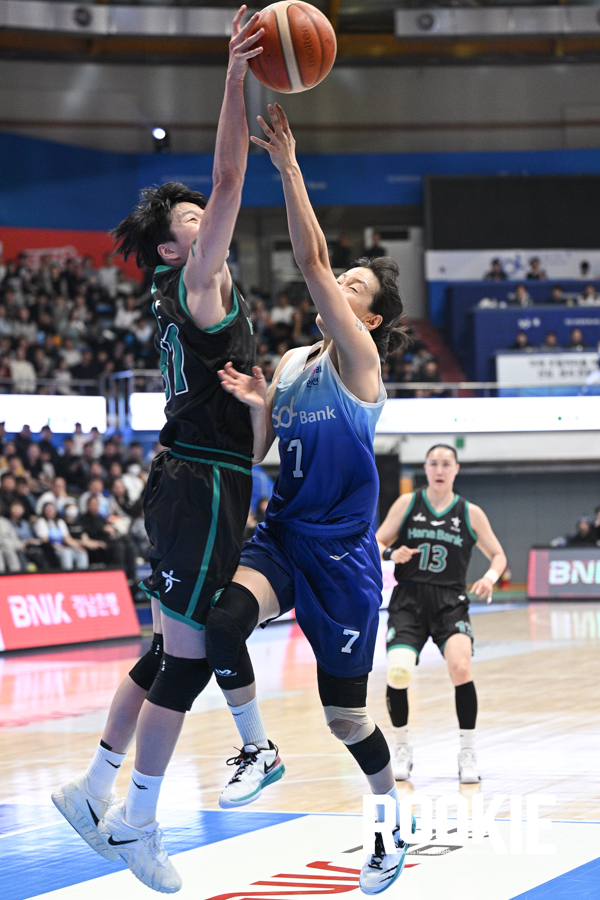 21일 인천에 위치한 도원체육관에서 ‘BNK 금융 2025~2026 여자프로농구’ 인천 신한은행과 부천 하나은행의 경기가 열렸다. 하나은행 진안이 신한은행 신지현의 슛을 블록하고 있다.