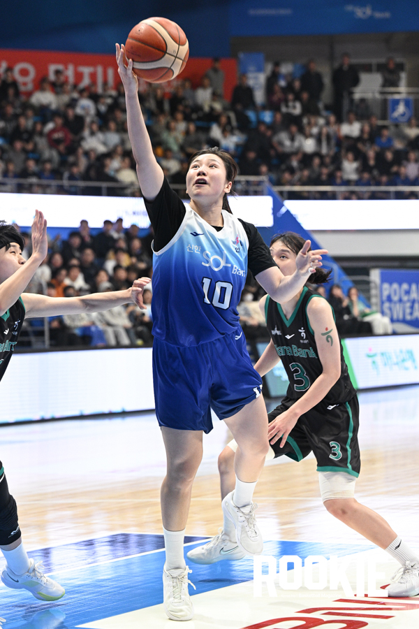 21일 인천에 위치한 도원체육관에서 ‘BNK 금융 2025~2026 여자프로농구’ 인천 신한은행과 부천 하나은행의 경기가 열렸다. 신한 이두나가 골밑 공격을 시도하고 있다.