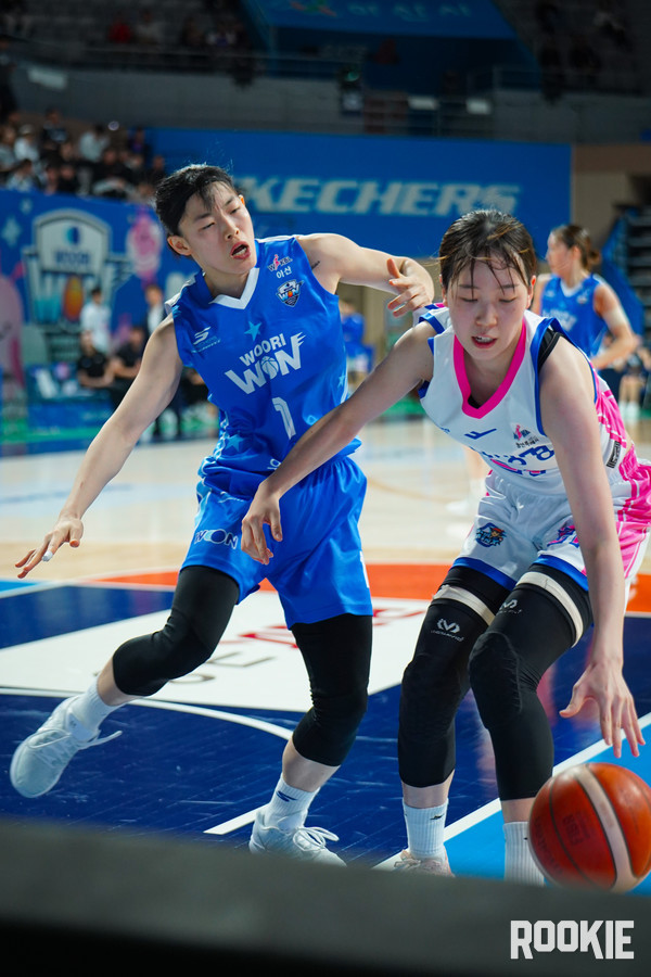 22일 아산에 위치한 이순신체육관에서 'BNK 금융 2025~2026 여자프로농구' 아산 우리은행과 용인 삼성생명의 경기가 열렸다. 우리은행 강계리와 삼성생명 최예슬이 리바운드를 하고 있다.
