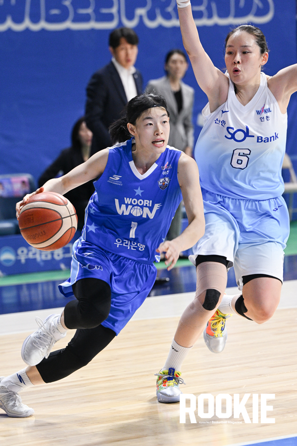 23일 아산 이순신체육관에서 ‘BNK 금융 2025~2026 여자프로농구’ 아산 우리은행과 인천 신한은행의 경기가 열렸다. 우리은행 강계리가 골밑 돌파를 시도하고 있다.