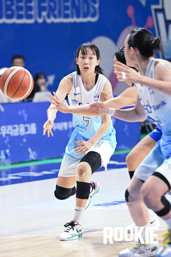23일 아산 이순신체육관에서 ‘BNK 금융 2025~2026 여자프로농구’ 아산 우리은행과 인천 신한은행의 경기가 열렸다. 신한은행 신지현이 골밑으로 패스하고 있다.
