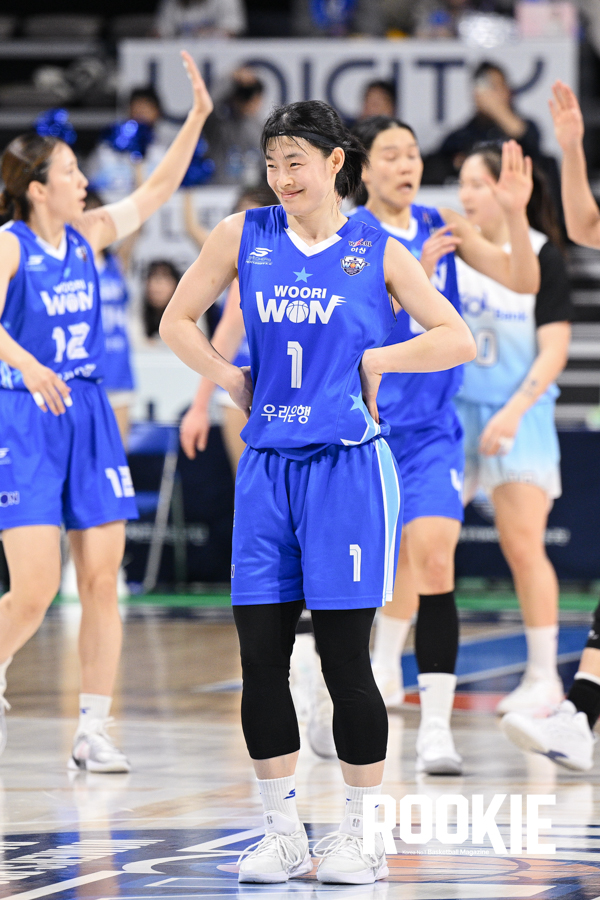 23일 아산 이순신체육관에서 ‘BNK 금융 2025~2026 여자프로농구’ 아산 우리은행과 인천 신한은행의 경기가 열렸다. 우리은행이 75:51로 승리하였으며, 승리의 주역 강계리가 승리가 확정되자, 세레머니를 하고 있다.