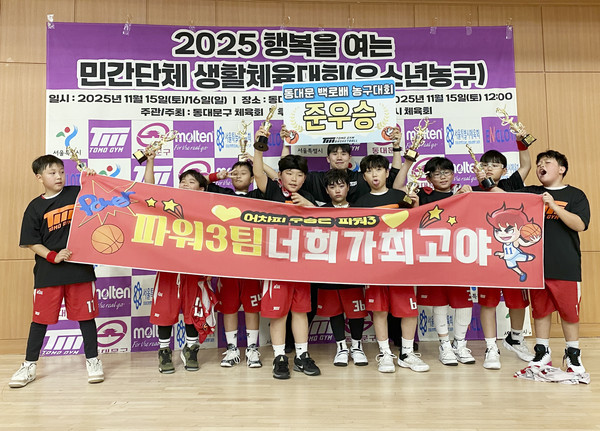 김준기(주장G), 김건우(G), 김태현(C), 길훤(G), 문시호(G), 박에녹(G), 박윤찬(F), 송시준(G) ,이재훈(F), 이하준(G), 정준우(G), 최주원(G)으로 구성된 파워3 팀이 지난 15일과 16일 이틀간 서울 동대구문구 체육관에서 개최된 2025 행복을 여는 민간단체 생활체육 농구대회에 출전해 시너지를 발휘한 끝에 준우승을 차지했다.