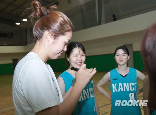 사실 KANCE를 취재하기로 결정될 때부터 학생들은 “포스트업을 비롯한 골밑 기술을 배우고 싶다. 또 센터를 이용한 팀 공격과 수비를 가르쳐줬으면 한다”는 바람을 밝혔다. 마침 이날 학생들 지도에는 지난 시즌을 마치고 은퇴를 선택한 양지희(전 우리은행)가 나섰다.