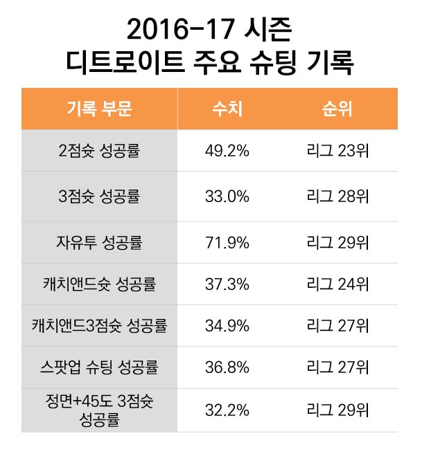 사실 디트로이트는 늘 슈팅이 고민거리인 팀이었다. 2015-16 시즌 디트로이트는 경기당 3점슛 성공이 9.0개로 리그 10위에 올랐는데, 정작 3점슛 성공률은 22위에 그칠 정도로 3점슛 효율이 좋지 못한 팀이었다. 이밖에도 2점슛 성공률(23위), 자유투 성공률(30위), 캐치앤드슛^ 성공률(24위) 등 대부분의 슈팅 효율 기록이 리그 하위권을 전전했다.