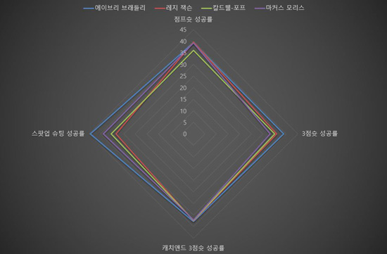 [▲지난 시즌 에이브리 브래들리의 각종 슈팅 효율 기록을 다른 디트로이트 선수들과 비교한 사각형 그래프. 4개 기록 모두에서 브래들리(파란색 선)가 대등 혹은 우위를 점하고 있는 것이 보인다.]