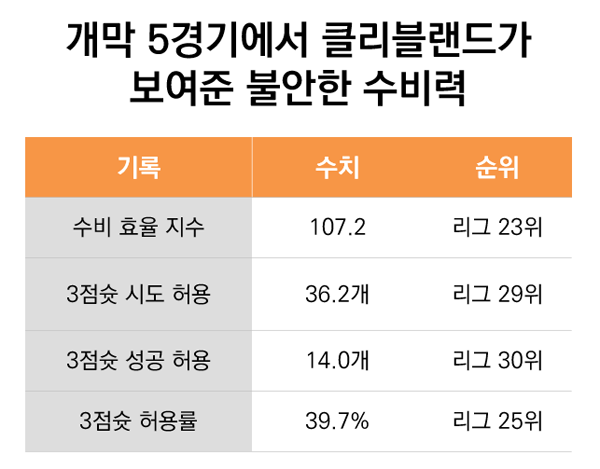 하지만 경기 페이스에 보정을 가해 ‘진짜 수비력’을 알 수 있도록 한 수비 효율 지수(100번의 수비 시도에서 예상되는 실점 값)를 보면 상황이 전혀 다르다. 클리블랜드는 107.2의 수비 효율 지수를 기록하며 이 부문 리그 23위에 머물고 있다. 경기 속도가 느린 팀들(밀워키, 시카고, 보스턴)을 만나 단순 실점 기록에서 혜택을 봤을 뿐, 실질적인 수비력은 리그 하위권에 속했던 것이다.