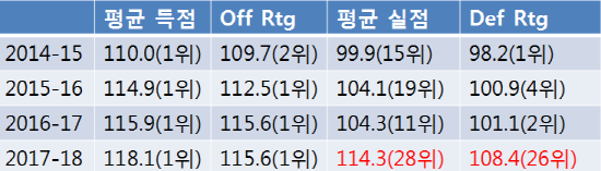 <표>최근 4시즌 골든스테이트 공수 지표 변화