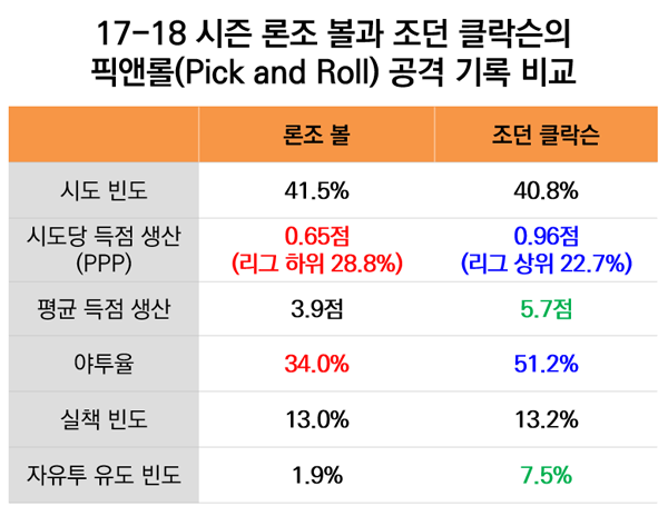 픽앤롤 공격 시 야투율도 34.0%(1.8/5.2)에 머물고 있다. 3개를 던지면 1개 정도 넣는 수준이다. 픽앤롤 공격만 보면 자신의 백업으로 나오는 조던 클락슨보다도 훨씬 못하다. 클락슨은 픽앤롤 공격 PPP가 0.96점으로 리그 상위 25% 안에 드는 선수다. 픽앤롤 공격 시 야투율은 51.2%에 달한다. 론조 볼이 아닌 조던 클락슨이 코트에 나왔을 때 왠지 공격이 더 잘 풀리는 것 같은 묘한 느낌은, 충분한 근거가 있는 ‘팩트’였던 셈이다.