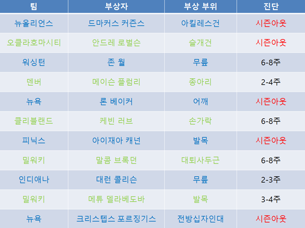 [루키=이학철 기자] 최근 NBA에 하루가 멀다 하고 부상자 소식이 쏟아지고 있다. 지난 1월 27일(이하 한국시간) 드마커스 커즌스가 시즌아웃 부상을 당한 이후로 약 열흘의 시간 동안 시즌아웃 부상자만 5명. 이외에 최소 2주 이상의 진단을 받은 선수를 포함하면 그 수는 무수히 늘어난다. 아래 표를 살펴보자.