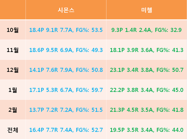 <표> 시몬스&미첼의 월별 및 시즌 기록