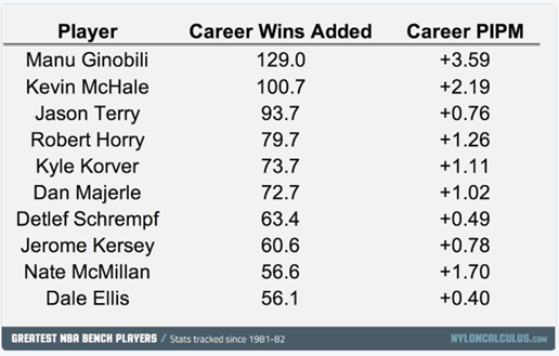 <나일론 칼큘러스>는 역대 식스맨들의 커리어 승수 기여 누적치(Career Wins Added), 커리어 임팩트 플러스-마이너스(Career PIPM) 기록을 도출했는데, 그 결과 지노빌리는 보스턴의 전설 케빈 맥헤일을 제치고 두 부문 모두 압도적인 1위인 것으로 드러났다. 왕년의 가장 잘 나갔던 식스맨들도 지노빌리의 기록에는 미치지 못했다. 지노빌리의 위대함을 새삼 확인할 수 있는 대목이다.