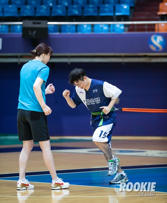 호루라기 소리와 함께 전력 질주를 했다. 앞에서는 정선민 코치가 지켜보고 있었다. “자유투 라인까지 나와야 한다”고 친절하게 알려줬다. 정 코치의 가르침대로 최대한 힘을 쏟았다. 종료 소리가 들리자 온몸에 있는 힘이 모두 빠져나간 느낌이었다.