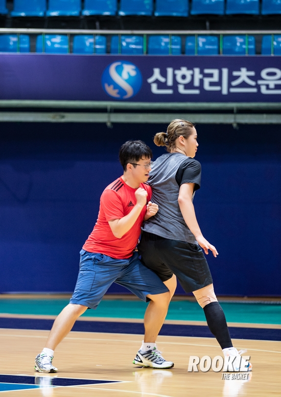 그런데 문제가 있었다. 이 동작들 모두 자연스레 몸을 부딪칠 수밖에 없다. 결국 농구선수와 몸싸움을 해야 한다는 소리다. 그것도 신한은행에서 가장 몸이 좋은 김연희와 말이다. 몸싸움할 때마다 부딪친 부위가 너무 아팠다.