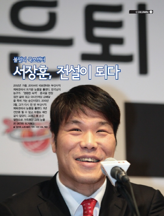 2002년 가을, 207cm의 국보센터는 부산사직체육관에서 뜨거운 눈물을 흘렸다. 한국남자농구가 ‘영원한 숙적’ 중국을 연장 접전 끝에 꺾고 아시안게임 금메달을 목에 거는 순간이었다. 2013년 3월, 그가 다시 한 번 부산사직체육관에서 눈물을 흘렸다. 11년 전만큼 뛸 수 없고 무릎도 예전 같지 않았다. 그러나 매 순간 열정으로 가득했던 그의 눈물은 여전히 뜨거웠다.