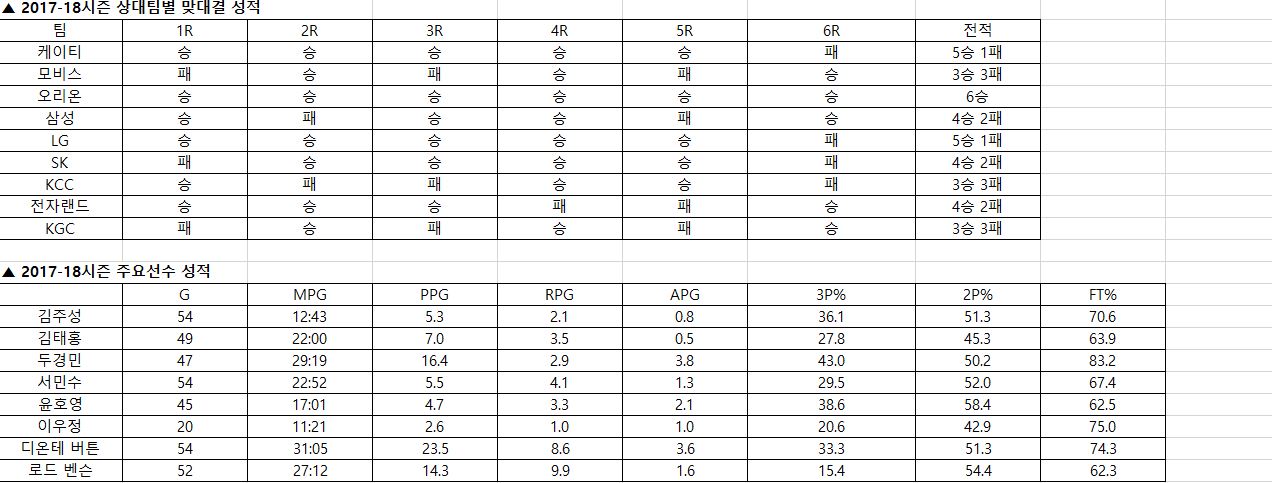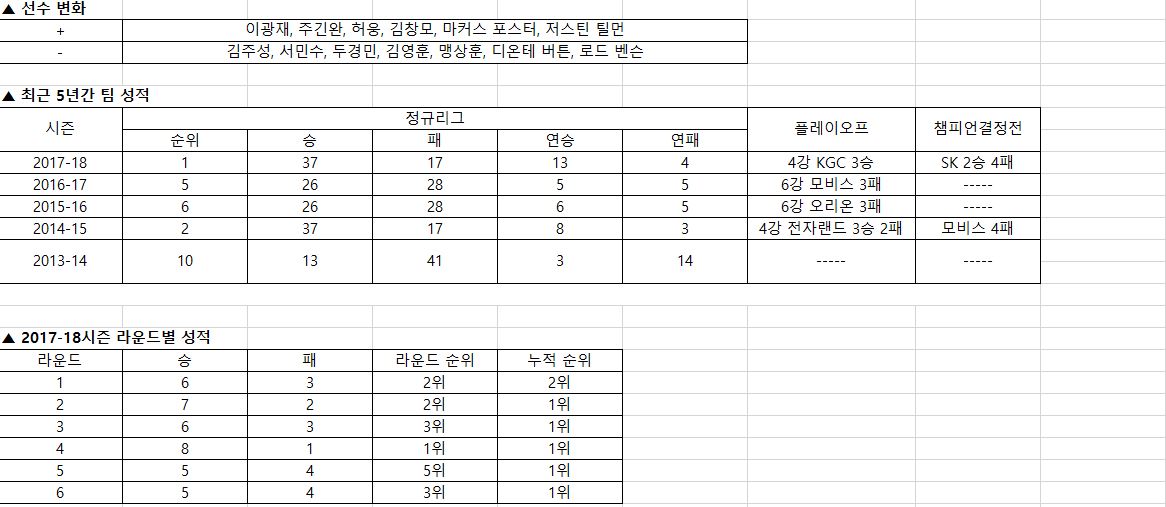 국내 선수 중에서는 윤호영과 김태홍이 팀에서 중심을 잡아줄 것으로 기대하고 있다. 두 선수 모두 제 몫은 하는 선수라 큰 걱정은 않지만 출전시간을 어떻게 할지에 대한 고민은 여전히 갖고 있다. 시즌에 맞춰서 조금씩 올리고 있다. 개인적으로는 앞선의 최성모나 박병우, 이우정, 김현호 같은 선수들이 득점에서 풀어주면 포스터의 부담도 줄어들고 높이에서는 틸먼의 리바운드 장악력이 있으니까 괜찮지 않을까 생각한다. 지난 시즌에 선전을 펼쳤지만 그것은 잊은 지 이미 오래다. 올 시즌에는 현실적으로 6강 플레이오프 진출을 목표로 삼고 있다. 현재 팀에 젊고 어린 선수들이 많기 때문에 시즌을 치르다보면 연패를 탈 수도 있다. 그럴 때마다 격려와 응원을 해주신다면 선수들도 힘이 나서 잘 뛸 수 있을 것 같다.
