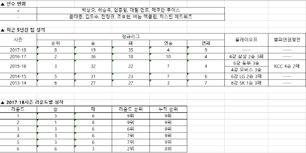 지난 시즌 8위에 머물면서 플레이오프 진출에 실패했다. 리빌딩 시즌이었다고는 해도 아쉬운 결과였다. 언론에서 이미 언급했다시피 시즌 중반에 이승현이 돌아올 때까지만 잘 버티고 좋은 경기력을 보여주면 그 후에는 충분히 좋은 성적을 기대해볼 만하다고 생각한다. 올시즌 목표는 플레이오프 진출이다.