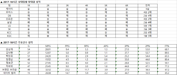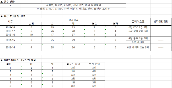 기디 팟츠와 머피 할러웨이 등 외국선수들이 기본적인 것을 해준다고 했을 때 승부를 가르는 것은 국내선수의 몫이다. 팀의 주포를 맡고 있는 슈터 차바위를 비롯해 국가대표인 강상재와 정효근, 포워드 김상규, 2년차 가드 김낙현 등 국내선수 쪽에서 일정 이상의 득점이 나와줘야 한다.