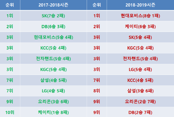 <표> 2017-2018시즌과 2018-2019시즌 1라운드 성적 비교