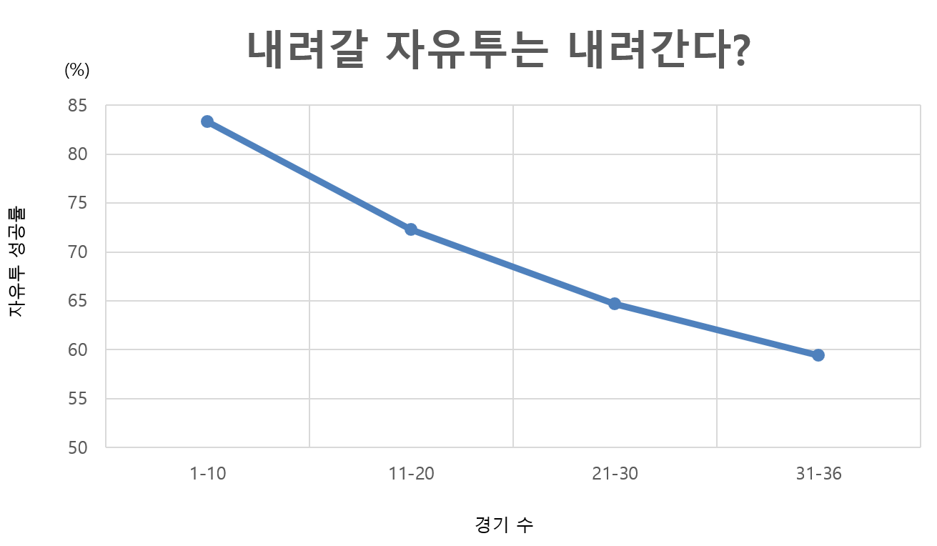 문제는 그 이후다. 개막 후 10경기에서 83.3%의 자유투 성공률을 기록한 조던은 그 뒤 10경기에서 72.3%(34/47)의 성공률을 기록했고, 그 후 10경기에서는 64.7%(22/34), 그 후 6경기에서는 59.4%(19/32)를 기록했다. ‘우하향’ 그래프다.
