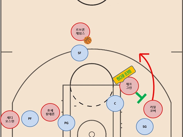 패턴 플레이를 실행하는 과정에서 엘보우에 위치해 있던 제프 그린이 코너에 서 있던 카일 코버에게 스크린을 건다. 핀다운 스크린이다.