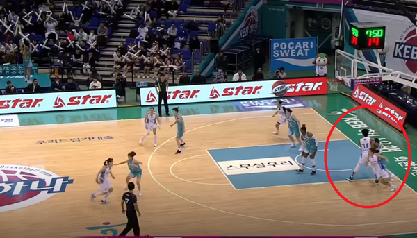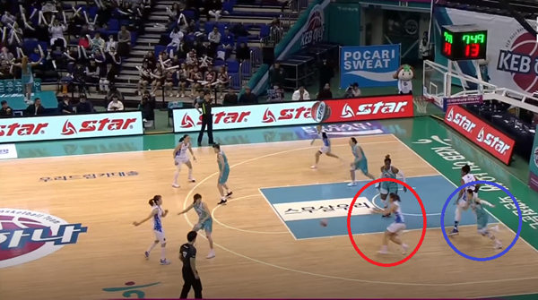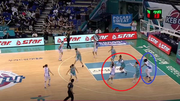 강이슬이 완전히 임영희를 놓쳐버린 탓에 토마스의 마크맨인 샤이엔 파커가 임영희를 견제하기 위해 밖으로 튀어나오는 모습이다. 강이슬은 여전히 임영희를 쫓고 있다.