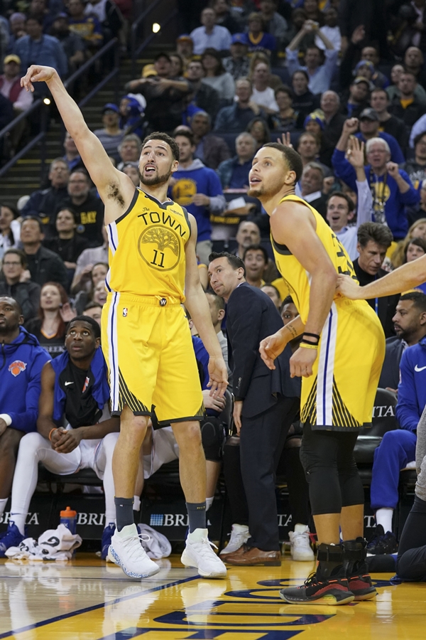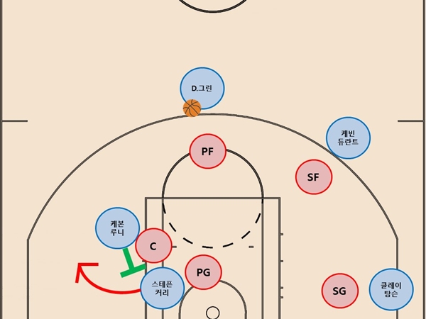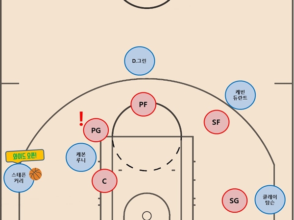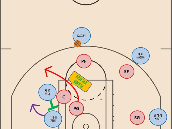 탑에서 드레이먼드 그린이 볼을 가지고 있고 스테픈 커리는 림 밑에 서 있다. 케본 루니는 엘보우 부근에서 커리를 위해 핀다운 스크린을 걸어준다. 커리의 볼 없는 움직임을 활용하는 전형적인 공격 패턴이다.