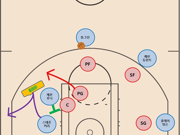 플레어 동작을 가져간 후의 모습이다. 커리의 수비수인 ‘PG’는 커리를 완벽히 놓쳐버렸고, 커리는 코너 부근에서 완벽한 오픈 기회를 얻었다. 그린이 커리의 움직임에 맞춰 정확히 타이밍에만 패스를 뿌려 준다면 커리는 손쉬운 오픈 3점슛을 던질 수 있게 된다.