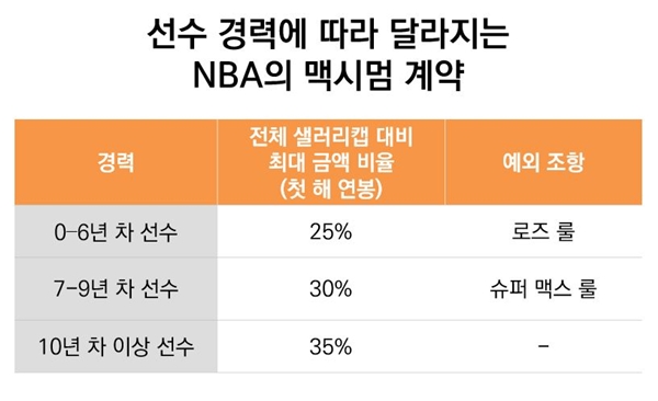 NBA 맥시멈 계약은 크게 두 가지 특징을 가지고 있다. ①맥시멈 계약의 첫 해 연봉이 절대적인 금액이 아닌 전체 샐러리캡 대비 비율로 정해지며 ②선수의 경력에 따라 그 비율이 달라진다는 점이다.