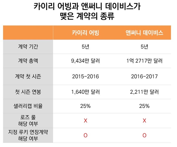 어빙과 데이비스가 공통적으로 맺은 계약은 ‘로즈 룰’ 계약이 아닌, ‘지정 루키 연장계약’이었다. 앞서 ‘지정 루키 연장계약’은 일방적인 루키 연장계약과 달리 최대 연장계약 기간이 5년에 달한다고 설명한 바 있다. 어빙과 데이비스는 모두 여기에 해당된다. 둘은 클리블랜드, 뉴올리언스와 5년 연장 계약을 맺으며 ‘지정 루키 연장계약’의 대상이 됐다.