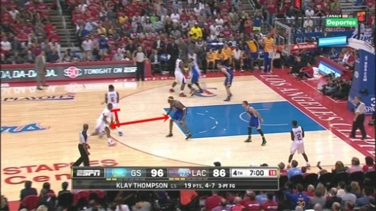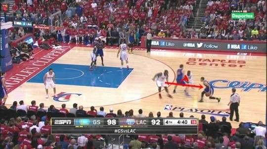 스크린 수비는 좋았다. 깊숙이 헷지 수비가 들어오면서 커리의 이동 경로를 막아냈다. 하지만 이후 로테이션이 문제였다. 커리가 헷지를 뚫고 패스를 날렸을 때 클리퍼스 선수들의 대응이 한 박자 늦었다. 이는 워리어스의 손쉬운 페인트 존 득점으로 이어졌다. 2:2게임 수비에만 신경을 쓴 나머지 그 외 3명의 움직임을 신경 쓰지 못한 게 실책이었다.