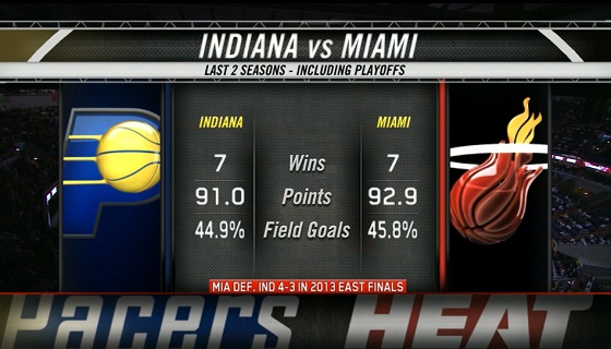 이쯤 되면 연례행사다. 2011-12시즌 플레이오프 2라운드에서 처음 마주친 두 팀은 3년 연속으로 플레이오프 맞대결을 펼치게 됐다. 2011-12시즌에는 인디애나의 전력이 한참 아래였다. 당시 인디애나는 이제 막 강팀으로 자리 잡아 가던 시기였다. 반면 마이애미는 2010-11시즌 준우승의 아픔을 딪고 심기일전하여 해당시즌 챔피언까지 오른 티이었다.