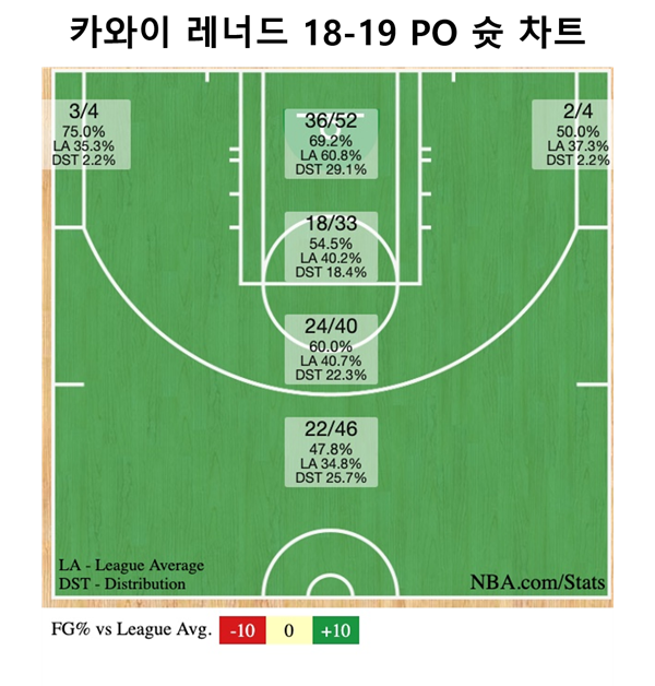 토론토의 레너드 의존증은 숫자로도 한눈에 나타난다. 토론토는 이번 플레이오프 레너드가 코트 위에 있을 때 119.2의 오펜시브레이팅(100번의 공격 기회에서 득점 기대치)을 기록 중인 반면 레너드가 없을 때 79.0에 그치고 있다.